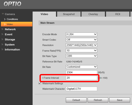 - The Optio cameras will automatically adjust the I-Frame value alongside the FPS, this value can be overwritten.